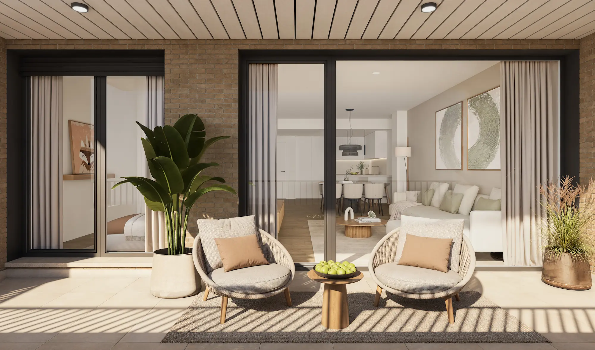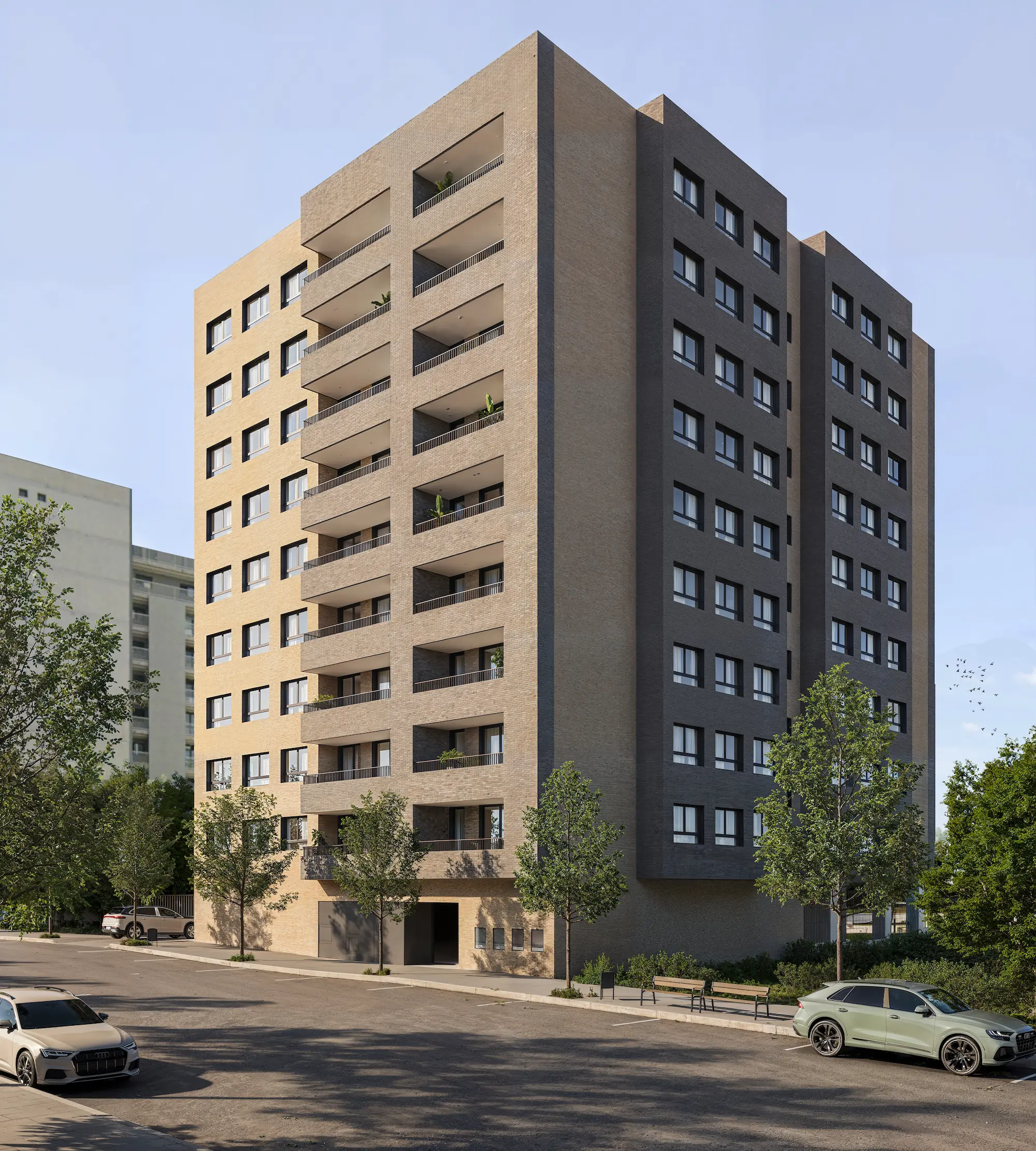 FACHADA DE LADRILLO CARA VISTA en cierre de terrazas, con trasdosado de ladrillo cerámico y raseo de mortero hidrófugo pintado al interior.